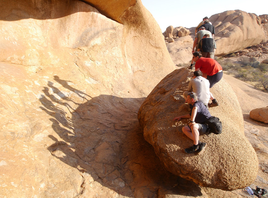 Damaraland is a land of stark desert beauty. Early morning mists, generated by the clash between the icy Atlantic Ocean and the warm desert air of the Skeleton Coast, drift inland along the canyons, providing sustenance to the flora and fauna of the region. Rare succulent plants abound in this harsh countryside. Damaraland includes the granite domes of the Spitkoppe rising above the desert floor. The rock engravings of Twyfelfontien, the San rock paintings in the Brandberg landscapes.