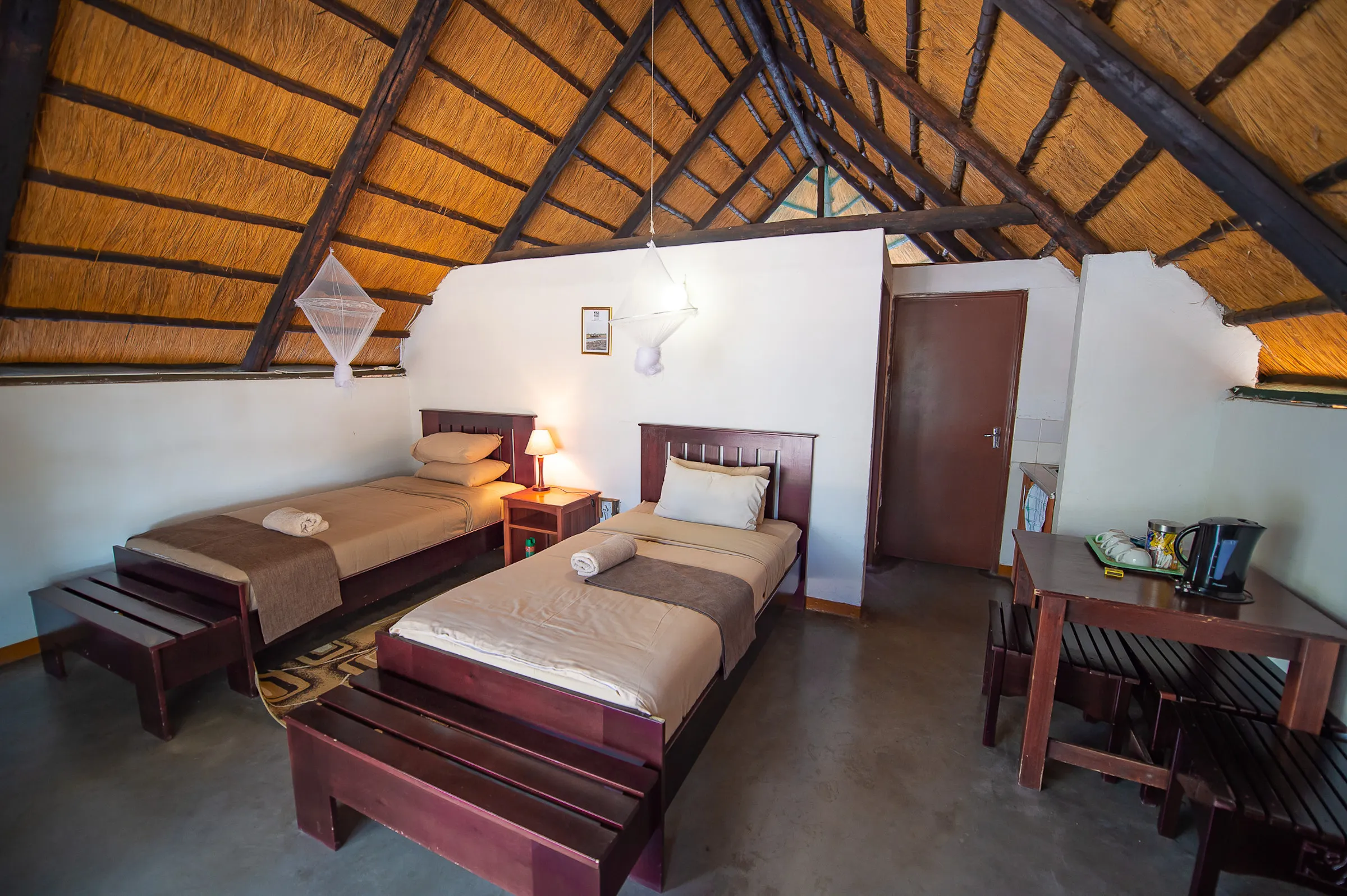 2 nights tented camp in the Okavango. Each tent has twin camp beds with linen and en suite chemical toilet. Shared bucket shower tent with hot water off the fire.